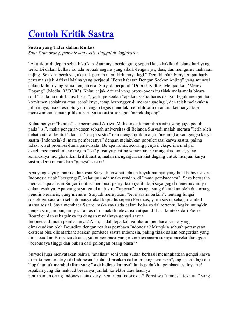 Contoh esai kritik sastra puisi, contoh kritik sastra singkat. Contoh kritik sastra novel ketika cinta bertasbih 2. Dikutip dari bahan ajar mata kuliah kritik sastra (2018) . Menulis merupakan cara efektif untuk menata logika berpikir dan mengasah kepekaan. Bulu perindu jarak jauhcontoh kritik sastra novel singkatbacalah sebuah buku .